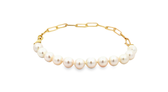 Akoya pearls, or cultured Akoya pearls, are a product of Japanese pearl farms. They are of very high quality, and are set in 18 karat gold clasps.
